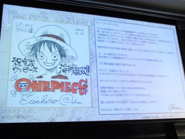 發表會中「尾田榮一郎」親筆繪製簽名插畫與撰寫短訊祝賀遊戲成功