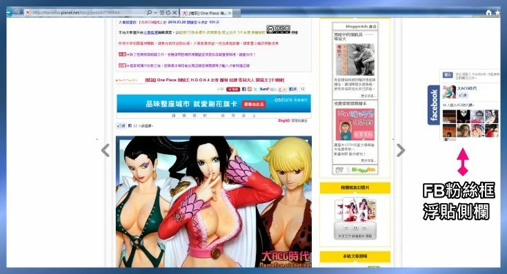 部落格也追加了FaceBook的浮貼粉絲框,滑鼠移動到「facebook」藍色圖標上才會出現,方便使用者加入、應援或是直接連到專頁,也不會阻礙版面因而影響到讀者的閱覽,可參考下圖解: